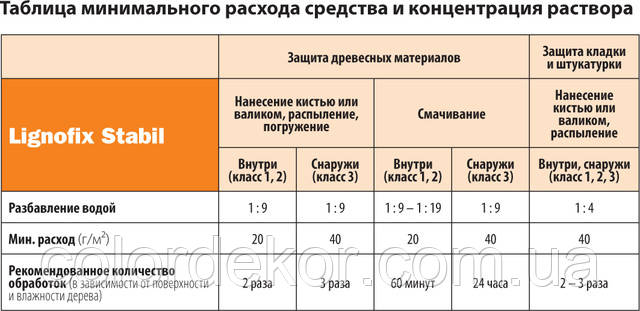 Расход: 1 кг концентрату на обробленні до 50 м2 дерев'яної поверхні.