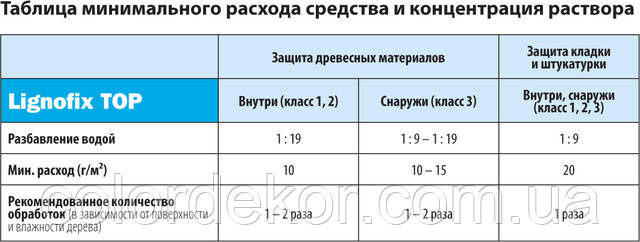 Інструкція із застосування: Для профілактичної обробки розведіть концентрат водою або спиртом, як це зазначено в таблиці та наносьте розчин пензлем, розпиленням або зануренням на ретельно очищену поверхню деревини за температури повітря від +5 °C до 35 °C. Якщо деревина вже уражена дереворуйнівним грибком, видаліть уражену частину, включно з не менш ніж 0,5 м здорової деревини від краю видимого пошкодження й замініть її новою. Коли уражена грибком дерево руйнується, ділянку повністю замінити неможливо, проведіть її санацію: видаліть верхню заражену частину деревини механічним способом (топором, рубанком) до здорової деревини; по всій площі ураження, включно з 0,5м у боку від вогнища, з інтервалами 8 см просвердліть отвори діаметром 3-4 мм на глибину до 3/4 товщини оброблюваного матеріалу; у зроблені отвори шприцем введіть розчин препарату, розведений у пропорції 1:9; після вбирання розчину ін'єкції повторіть. У разі ураження деревини жуком, введіть шприцем розчин у наявні видимі порожнини, утворені личинками жуків-деревочців. Якщо пошкоджена цегляна або кам'яна кладка, видаліть штукатурку, зачистьте шви, обробіть кладку пальником і проведіть оброблення препаратом (1 етап — іньєктаж, 2 етап — нанесення пензлем, валиком або розпилюванням). Виробник не несе відповідальності за наслідки неправильного використання засобу.
